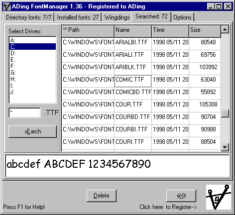 In "Directory fonts" tab you can view any fonts on your computer, you can saves samples as a JPEG, GIF or BMP image files, organize (copy, move, delete) fonts files even in ZIP archives, easyly installs any font of your choice, displays properties of fonts.